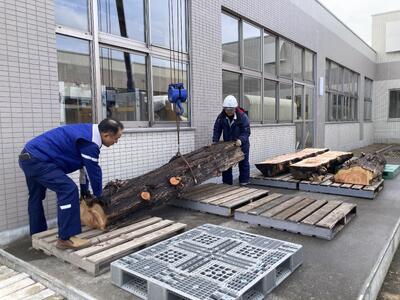 4月に、株式会社日本エスコン様より松材を寄贈していただきました。ありがとうございます。手稲区に建設のマンション敷地にあったもので、乾燥までは2年はかかると思われるのですが、この材を使った製品開発として人気製品のウッドスピーカーを試作したところ思いのほか良い音が出ましたので2学年の授業で沢山製作しました。次年度の学校祭で販売予定です。お楽しみに。