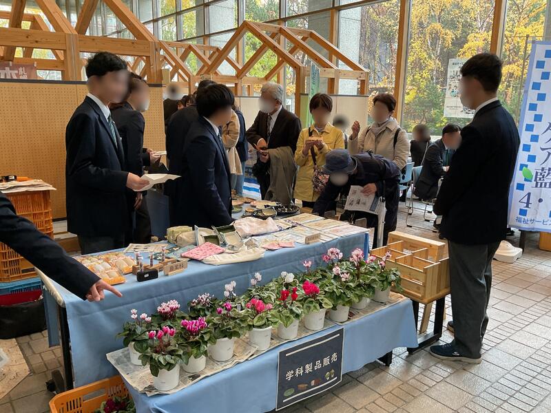 参加した生徒は8名。いずれも自ら立候補しての参加でした。販売が始まると、それぞれの所属学科に関係なく、本校の製品を一生懸命販売する姿が見られました。お客様は毎回お越しくださる方から初めての方まで様々で、どなたも優しく、積極的に声を掛けてくださり、生徒にとっては学校では得られない“生きた学び”の場となりました。