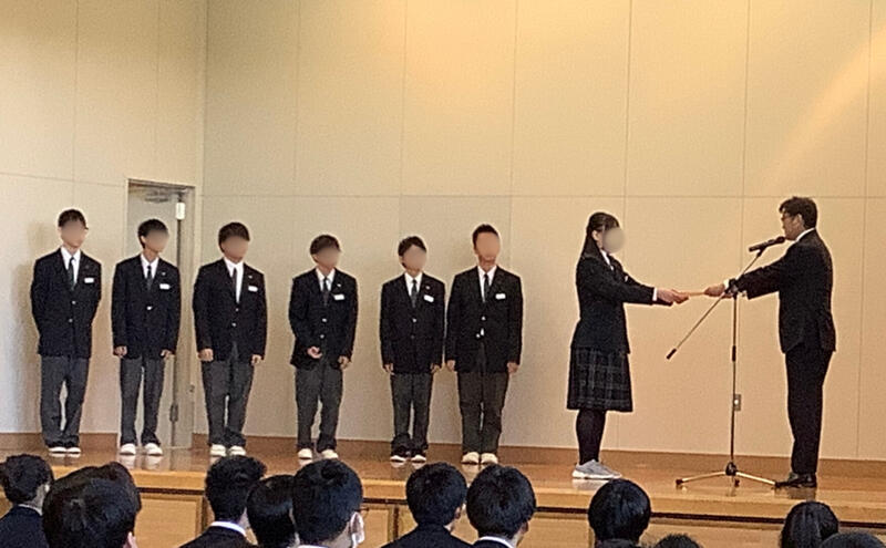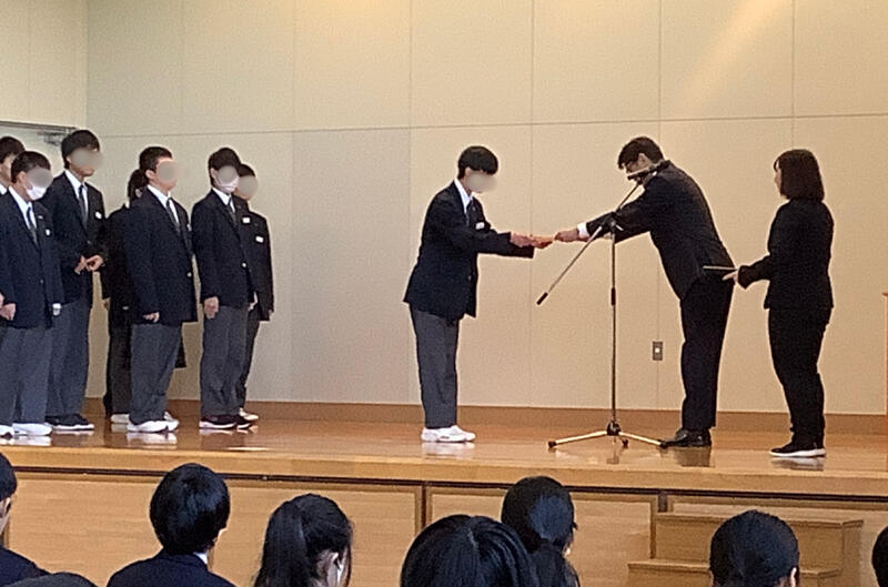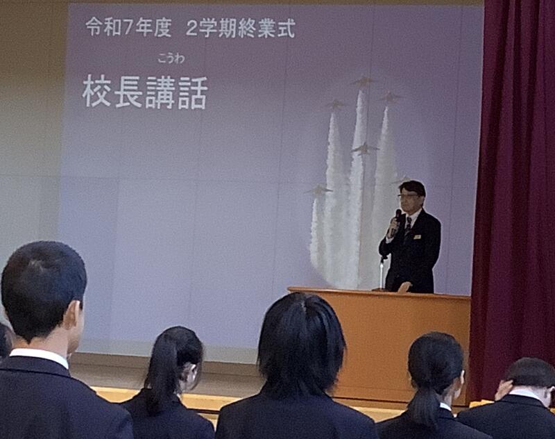 第2学期が終了し、4校時に終業式を行いました。校長講話では、校内に掲示されている生徒の作文紹介とともに2学期を振り返るお話がありました。式に先立ち、生徒会役員の任命式や校内作品展、検定、部活動の表彰も行われました。